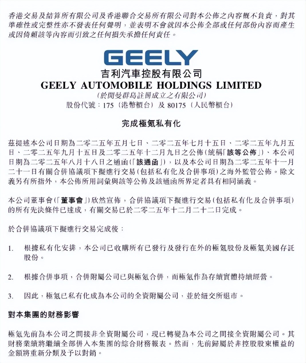 12月22日晚,吉利正式官宣完成對極氪的私有化,極氪成了吉利的全資附屬公司,同時(shí)從紐交所摘牌退市。從今年5月提出收購到最終落地,這場歷時(shí)7個(gè)月的整合,看似是一個(gè)品牌的“回歸”,實(shí)則藏著中國汽車產(chǎn)業(yè)從“單點(diǎn)突破”轉(zhuǎn)向“體系作戰(zhàn)”的大邏輯。咱們?nèi)锶硕记宄@事兒對吉利、對極氪,甚至對整個(gè)行業(yè),都不是小事。